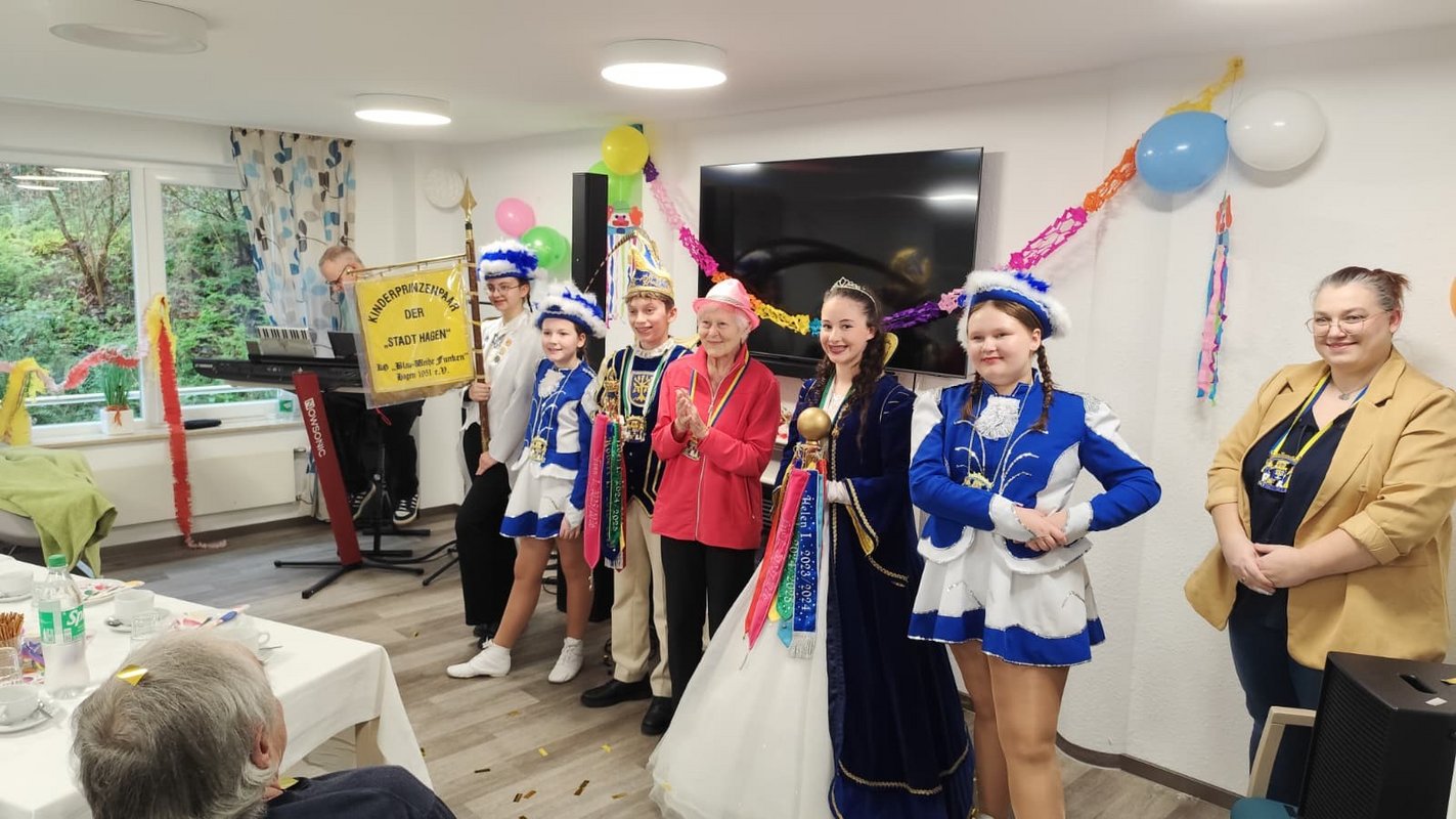 "Hagau lo gohn!" so wurde vom Kinderprinzenpaar der Stadt Hagen die Karnevalsfeier im Seniorenzentrum eröffnet. Frau Elfriede Niemann erhielt dieses Jahr den Karnevalsorden vom Kinderprinzenpaar der Blau-Weisse Funken Hagen von 1951 e.V.